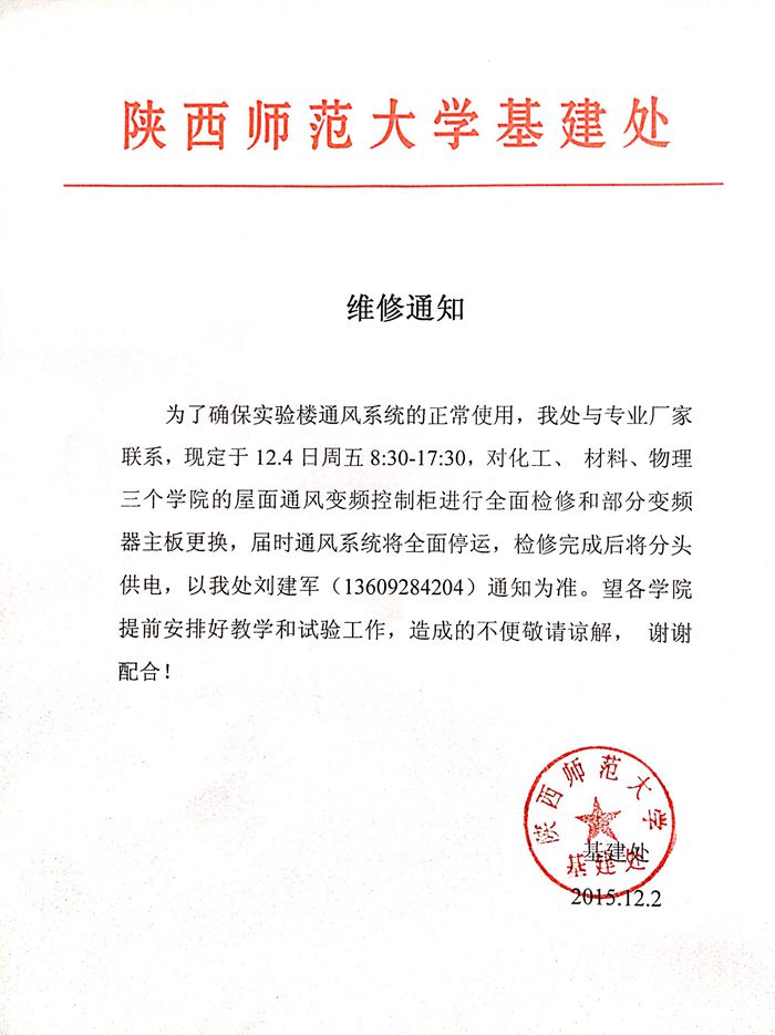 为了确保实验楼通风系统的正常使用,基建处定于12月4日(本周五)8:30-17:30,对我院屋面通风变频控制柜进行全面检修和部分变频器主板更换,届时通风系统将全面停运,检修完成后恢复供电。请各实验室提前安排好教学和实验工作,造成的不变敬请谅解,谢谢配合。