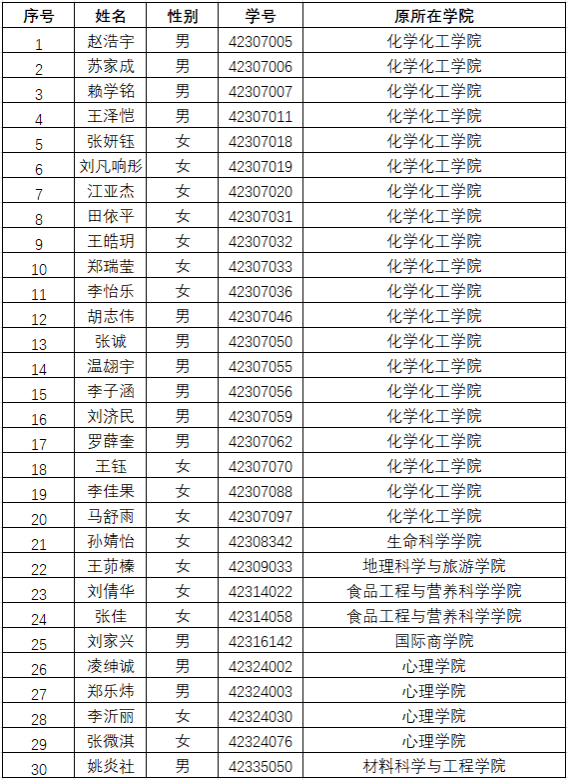 根据《关于做好2023级“人文科学试验班”“理科试验班”新生选拔工作的通知》和《化学化工学院2023级本科生化学笃学班选拔综合考核方案》,我院在学生自愿报名基础上,经过笔试、综合面试考核环节,现将2023级化学笃学班拟入选学生名单公示如下(按照学号由小到大顺序排列):
