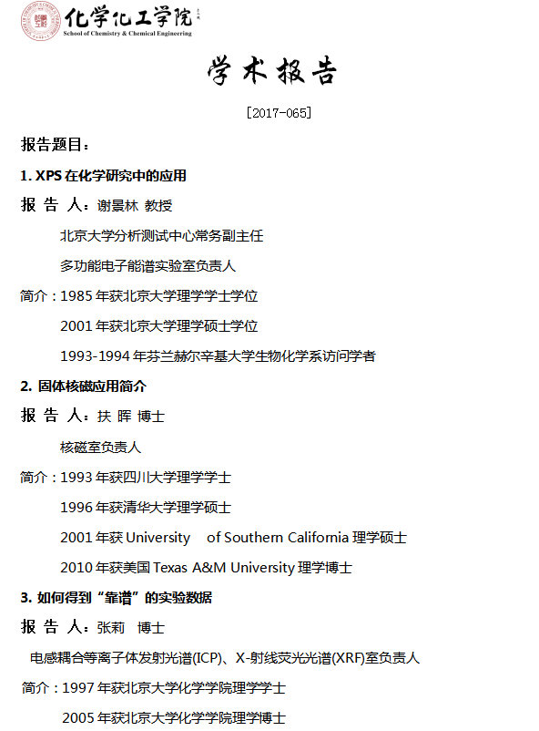 1. XPS在化学研究中的应用2. 固体核磁应用简介3.如何得到“靠谱”的实验数据4. 电镜技术在材料科学中的应用5. 北京大学分析测试中心信息化建设及质谱应用案例