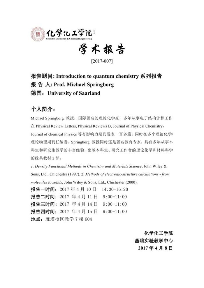 Michael Springborg教授学术报告预告[2017-007]