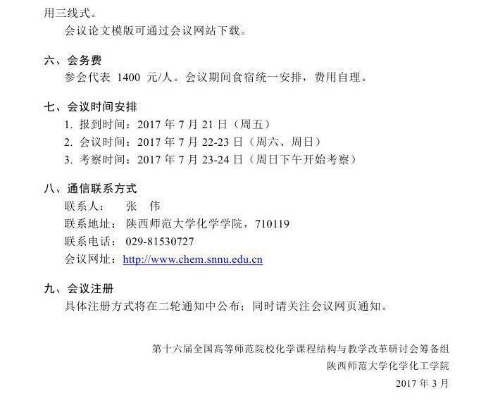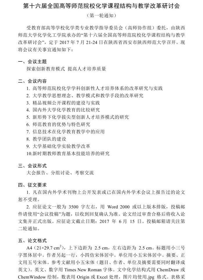 附:第十六届全国高等师范院校化学课程结构与教学改革研讨会通知(第一轮通知)