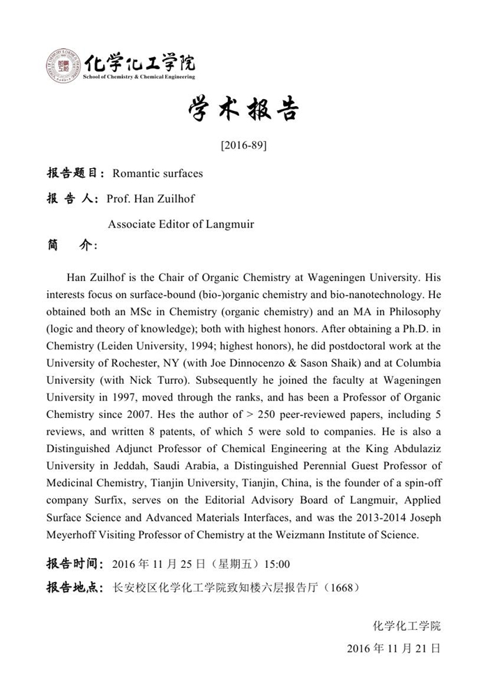 Han Zuilhof教授学术报告预告[2016-89]