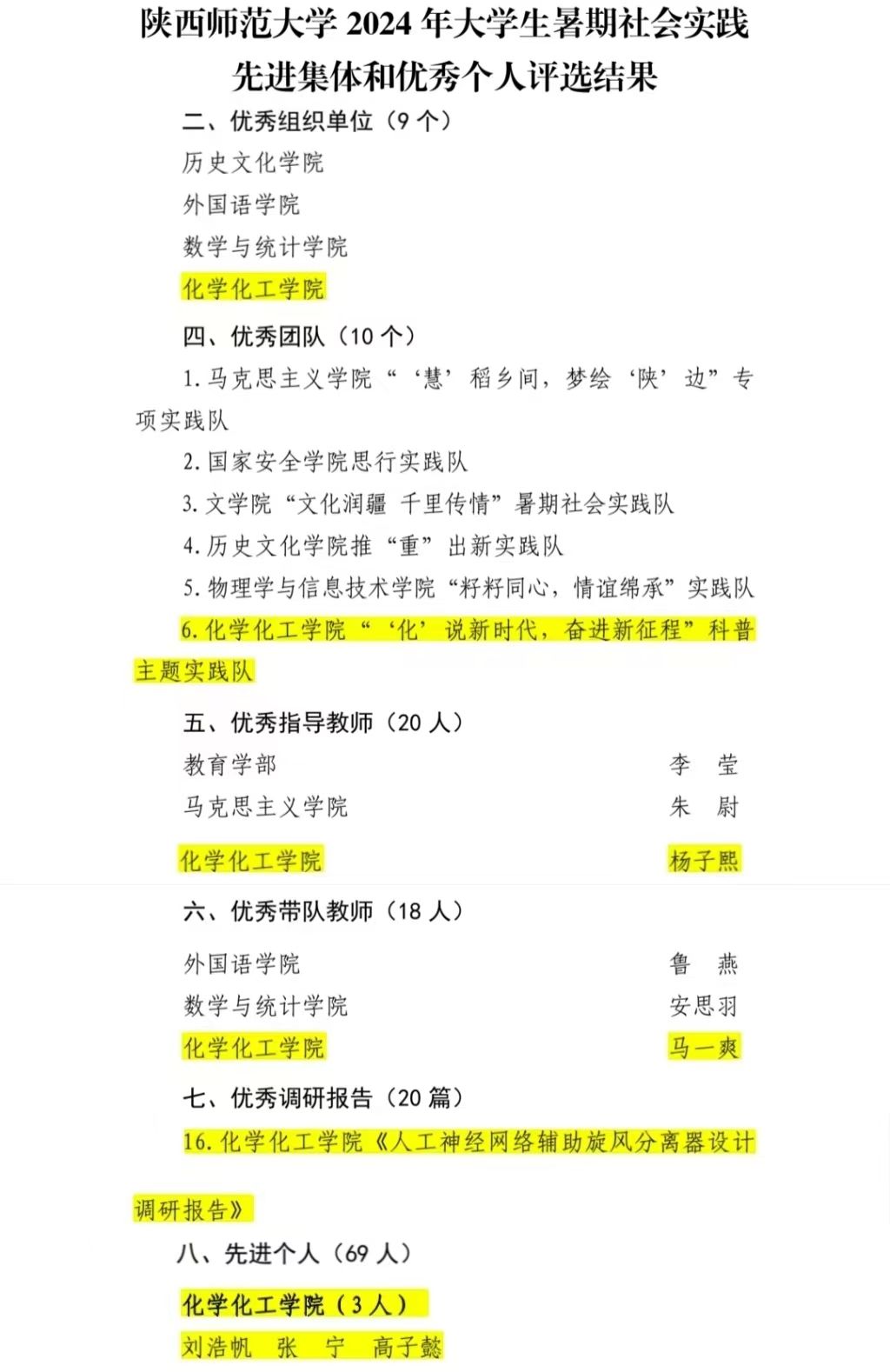 三是实践归来话成长,评选一系列优秀实践团队和个人。在陕西师范大学2024年暑期社会实践先进集体和优秀个人评选结果中,学院涌现出众多表现突出的团队和个人,为学院取得了各项荣誉。化学化工学院荣获优秀组织单位,“‘化’说新时代,奋进新征程”科普主题实践队荣获“优秀团队”荣誉称号,杨子熙老师荣获优秀指导教师,马一爽老师荣获优秀带队教师,《人工神经网络辅助旋风分离器设计调研报告》荣获优秀调研报告,刘浩帆、张宁、高子懿三位同学荣获先进个人。学院在10月27日召开全院的暑期社会实践分享交流会。