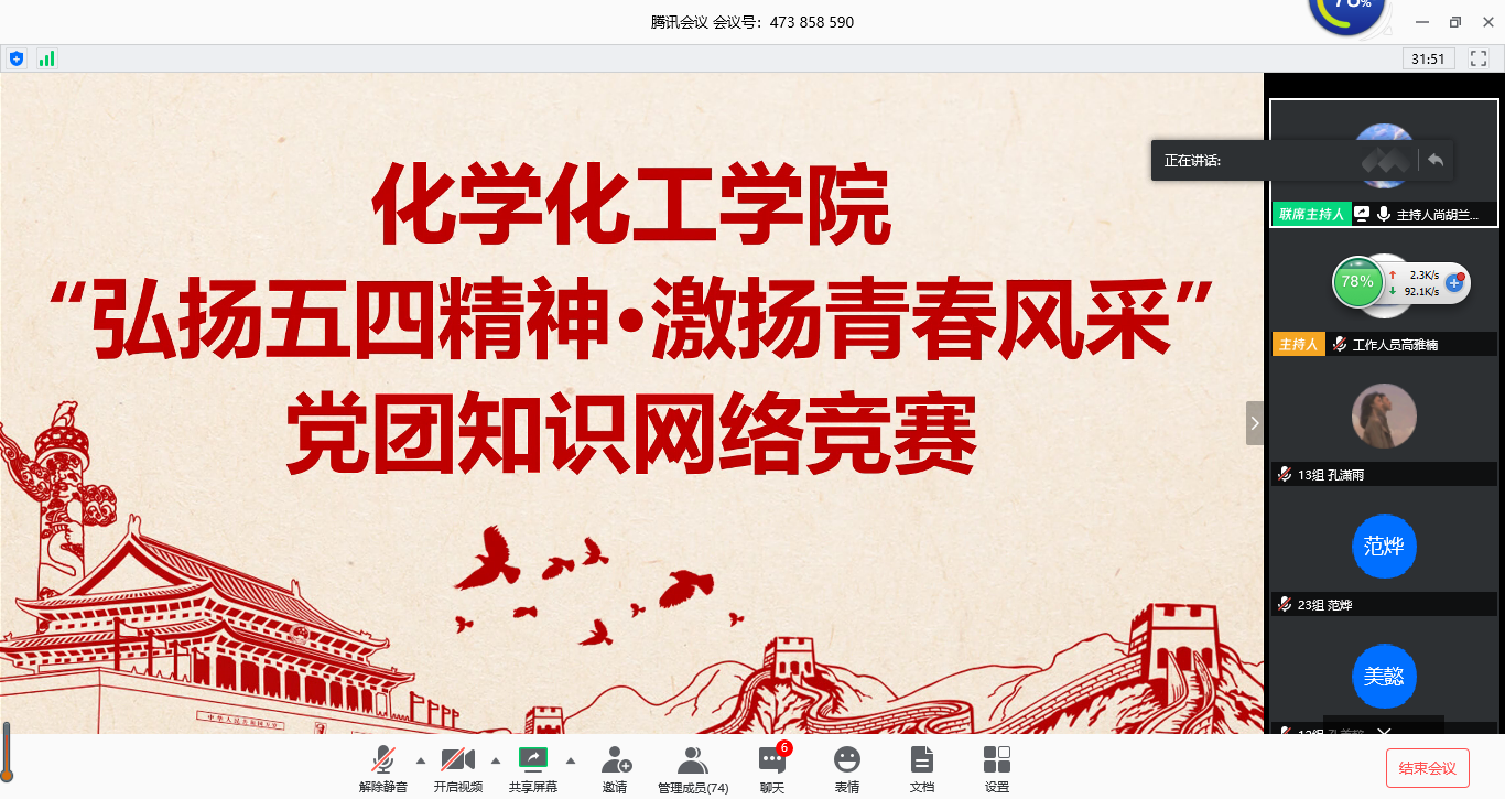线上会议互动竞赛于5月2日晚上7点在腾讯会议举办,采取团队战的形式,每组3名同学,共有24个小组72名同学参与其中。比赛过程中,主持人展示题目五秒后工作人员会在讨论区放出抢答开始的指令,各团队在讨论区中输入规定的抢答口令进行抢答,按照抢答顺序依次进行打开麦克风进行作答。每位参赛同学都以饱满的热情积极参与到活动中,反应迅速、应答如流,现场氛围良好。每道题抢答结束后,主持人会结合题目做出讲解和拓展。最终通过100道初赛题目和30道加时赛题目的激烈角逐,决出一等奖小组一名,二等奖小组两名,三等奖小组三名,优秀奖小组若干。