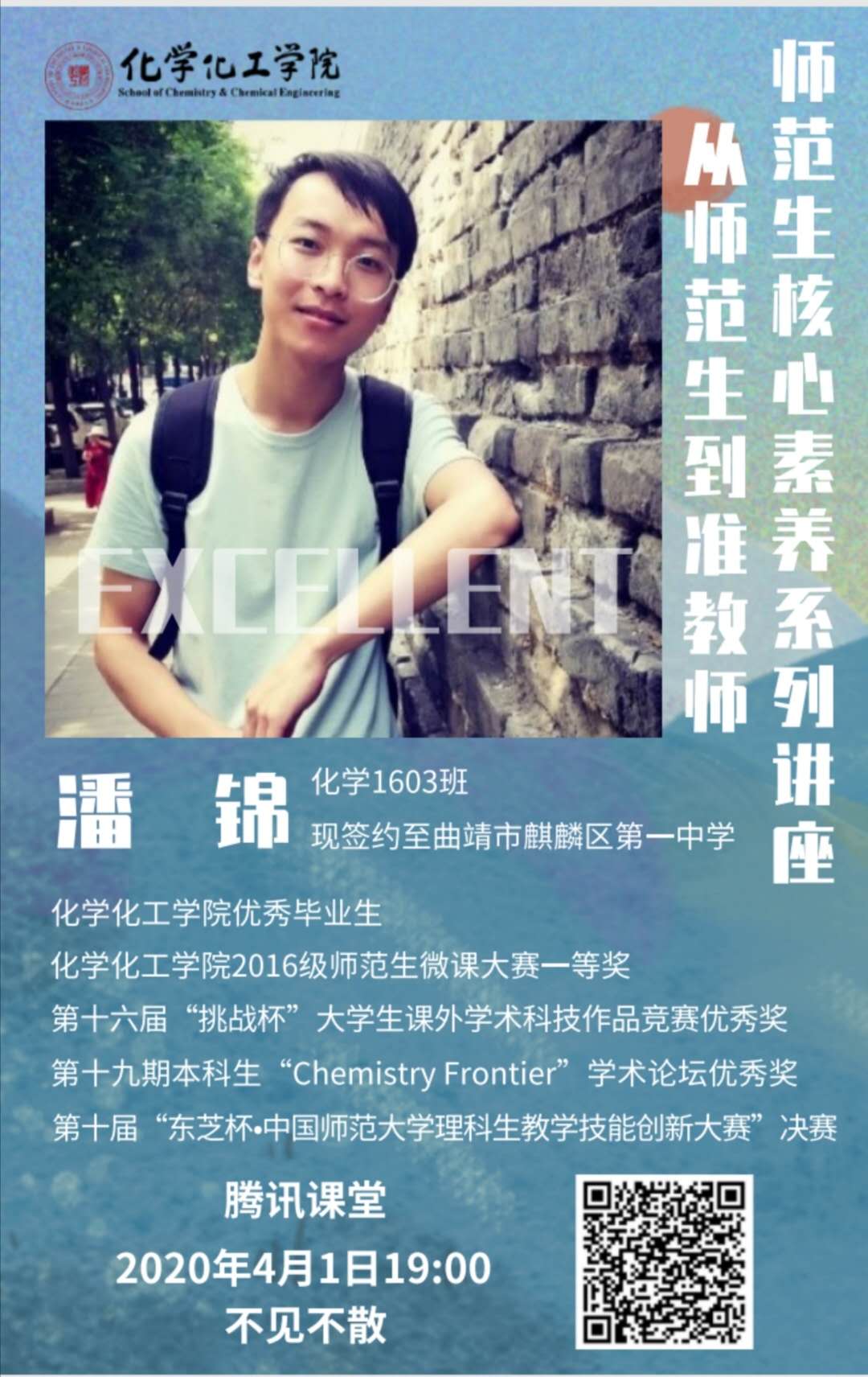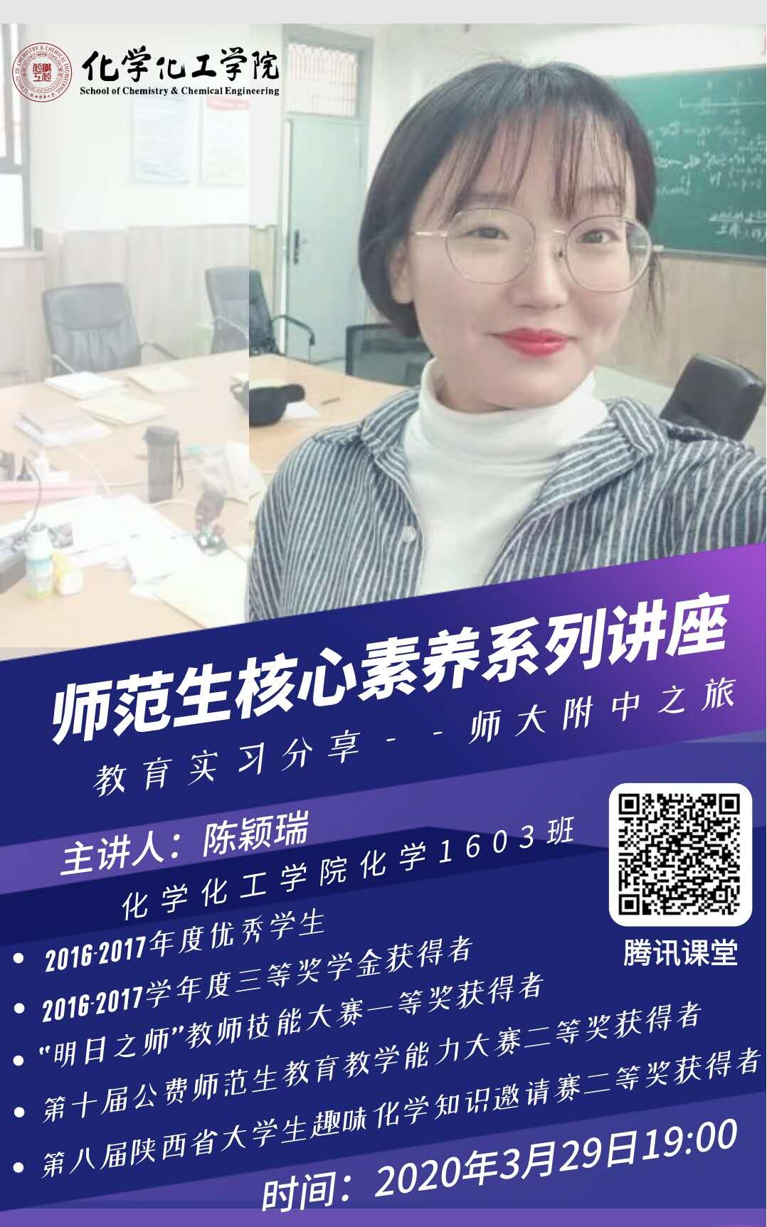 当前,全民抗击新冠肺炎疫情的斗争仍然持续进行,我院学子仍然坚持居家隔离,开展在线学习。为了提升师范生的教师核心素养,解决师范生对自身发展的疑惑,化学化工学院学生会组织部开展了“学而为师,行为世范”的师范生核心素养专题线上讲座。自3月29日起,三场各具特色的专题讲座借助腾讯课堂线上平台陆续开展。我们有幸邀请到我院16级优秀学子陈颖瑞、折凌云和潘锦来为大家分享知识经验和学习资源,众多化院师范生踊跃参与,线上课堂“座无虚席”,现场气氛积极活跃。