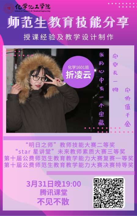 3月31日,折凌云同学向大家分享了有关教学技能的经验。首先,她向同学们阐述了教学技能的重要性——教学技能是成为优秀教师所必备的核心职业技能和职业素养,介绍了教学技能包括教学设计技能、教学组织与实施技能以及教学反思与反思研究技能;接着她从说和写两个方面介绍了教学基本要求,分享了自己参加教师教学能力大赛以及如何备课的经验,着重展示了教学设计思路及方案,提出了“应始终将化学核心素养放在教学设计的首位”的观点,建议人手一本教学参考书。“讲课、做课件都要来源于课本,高于课本”折凌云同学如是说道。最后折凌云同学对同学们提出的一些有关教学方面的问题进行一一解答,并向同学们推荐了一些对提升教学能力有益的公众号。这次讲座使同学们对教学技能有了更进一步的了解,同时也使同学们对如何备课以及课前、课中以及课后该如何做有了更清晰的认识。