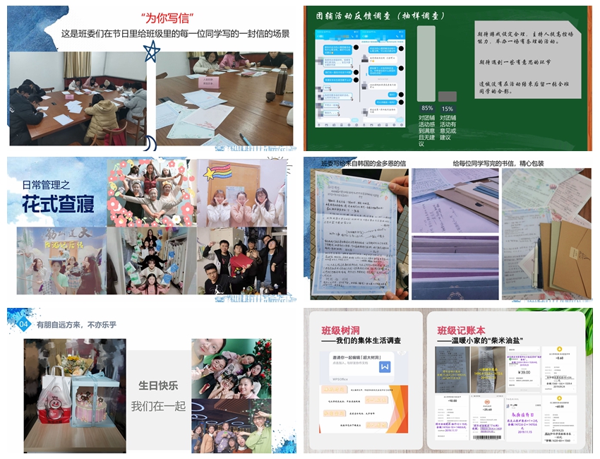 活动中,各班班长结合幻灯片、视频、演讲等形式,全面汇报展示了入学以来在班级管理制度、班级干部队伍建设、学风建设、党团建设、第二课堂活动等方面取得的成果。日常管理方面,各班介绍了“为你写信”“花样查宿”“班级树洞”“班级生日会”“班级记账本”等特色做法,班委将组织者与服务者的角色相融合,营造了和谐融洽的班级氛围;