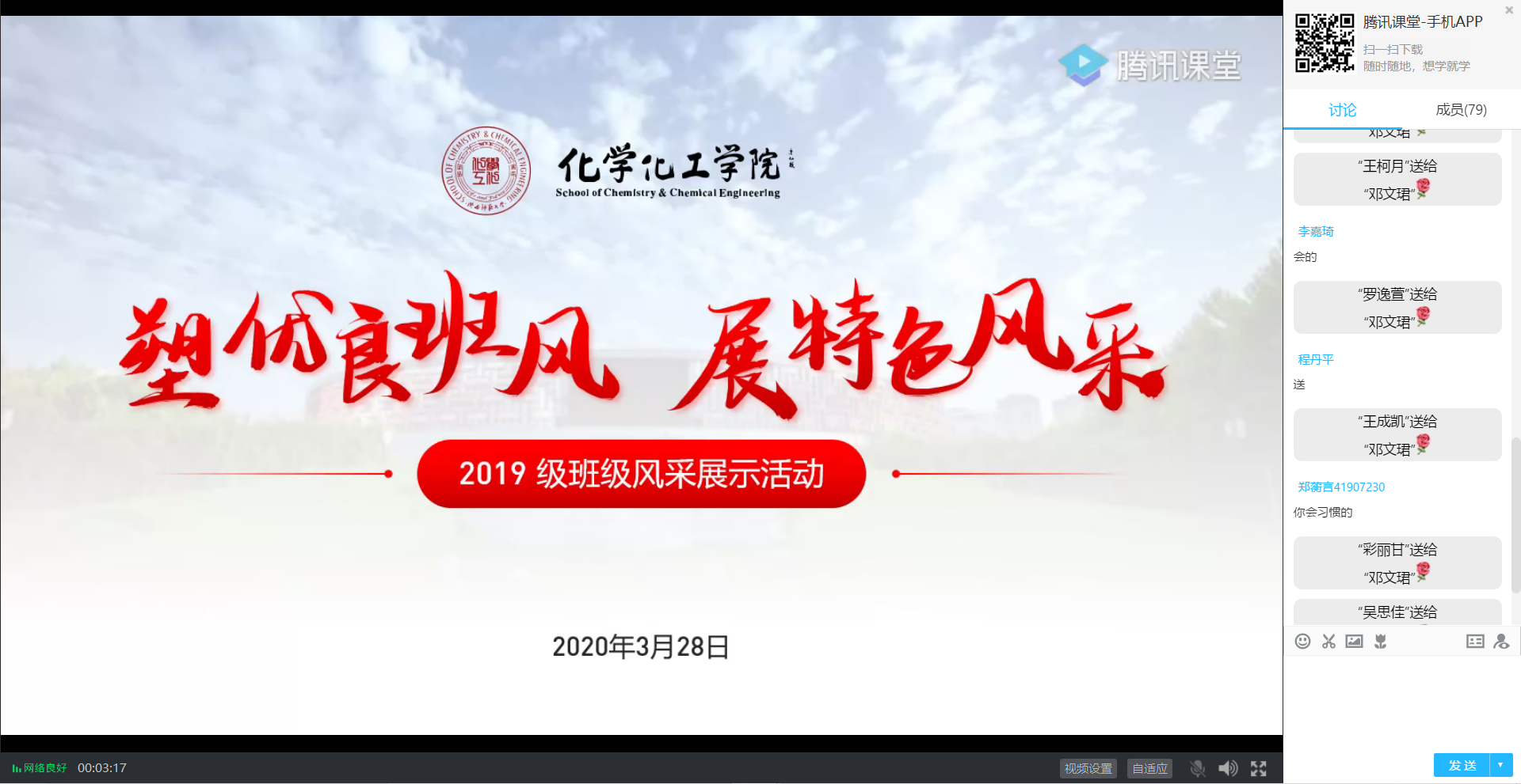 为扎实推进疫情防控期间的学生教育管理工作,积极调整育人模式和载体适应新形势,保证班风建设和学风建设“不缺位”,3月28日,我院2019级辅导员邓文珺以“强班风、优学风、促校风”为宗旨,利用“腾讯课堂”在线平台,策划并开展班级风采“云展示”,促进班级之间的交流碰撞,推动良好班风的形成。