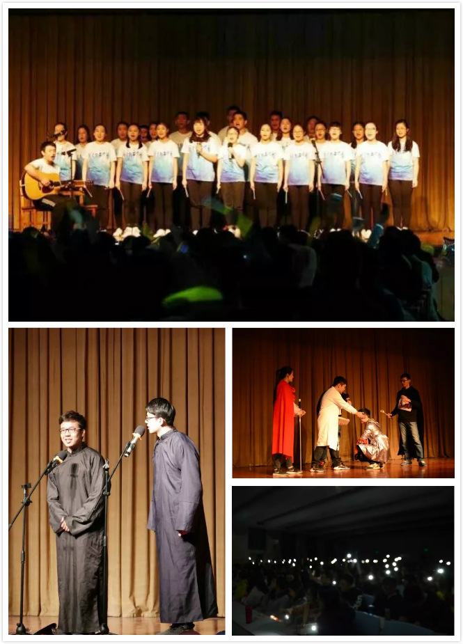 晚会开场,我院学生会外联部、学习科研部带来的《祖国颂》以激昂的文字歌颂祖国,让祖国看到我们的决心。一颦一笑、一举一动都带着异域风情,舞蹈活泼优美,步伐轻快灵巧,伴着绚丽的舞裙和飘飘的舞步,2017级的少数名族为我们带来了《迷情新疆》。紫云相声社的节目一直深受我校师生的喜爱,本次晚会我们有幸请到两位同学为我们带来了《智取威虎山》,惹得大家捧腹大笑,赢得阵阵掌声。由朝气蓬勃、热情奋发的17级同学带来的合唱《我最闪亮》和民谣串烧《我在这里》,更有乐器合奏《凉凉》引发台上台下大合唱,为大家呈现一场视听盛宴。来自2017级同学的小品《元素之争》、《大一人生》令人眼前一亮,表演投入、剧情曲折。穿插于节目中的抽奖环节更是将晚会推向了高潮,同学们积极参加,会场气氛热烈。2017级学生会文艺部带来的《sugar or salt》点燃现场气氛,掌声雷动,单人小品《谁是最可靠的人》让现场感动与欢笑交织。最后,本次晚会在《相亲相爱一家人》全场大合唱的热烈氛围中落下帷幕。