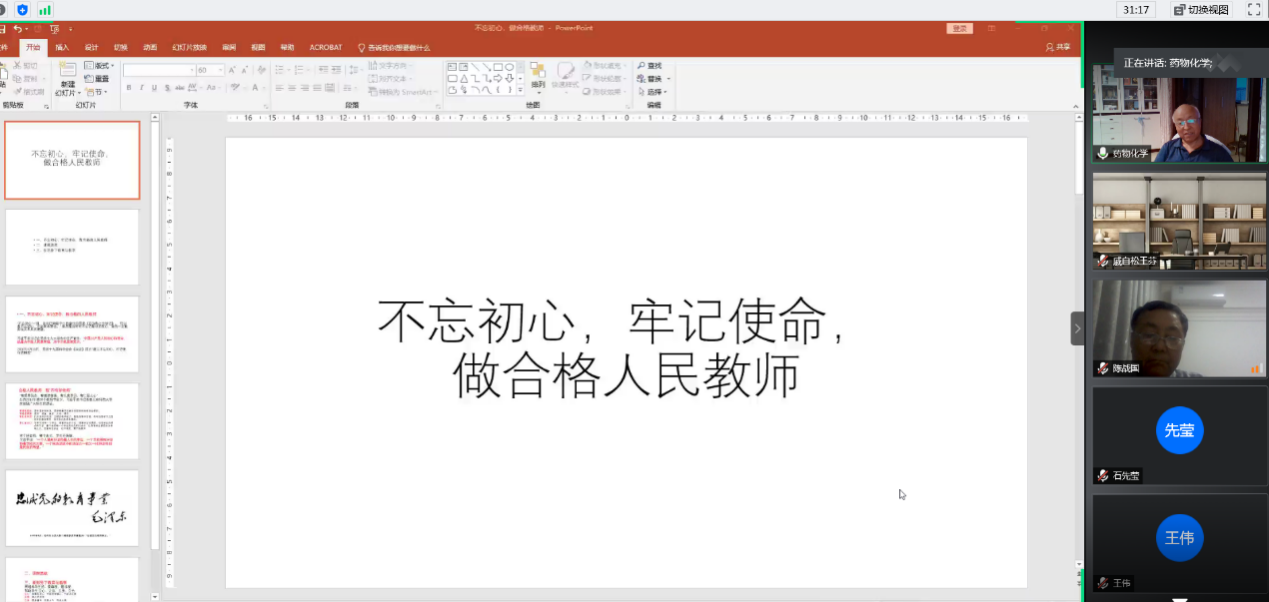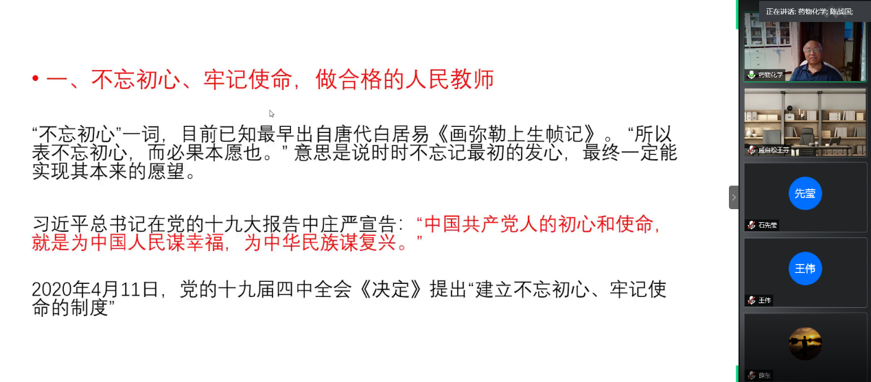 6月17日晚,教工分析化学党支部15名党员(1名党员网络拥堵)齐聚云端,采用腾讯会议,开展了一次别开生面的支部组织生活学习活动。此次学习的主题是“深化教师师德师风建设,恪守“新时代高校教师职业行为十项准则”,努力成为‘四有’好老师”。