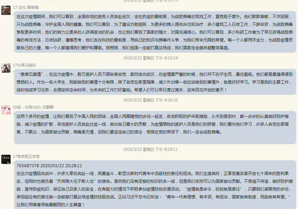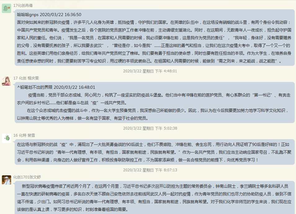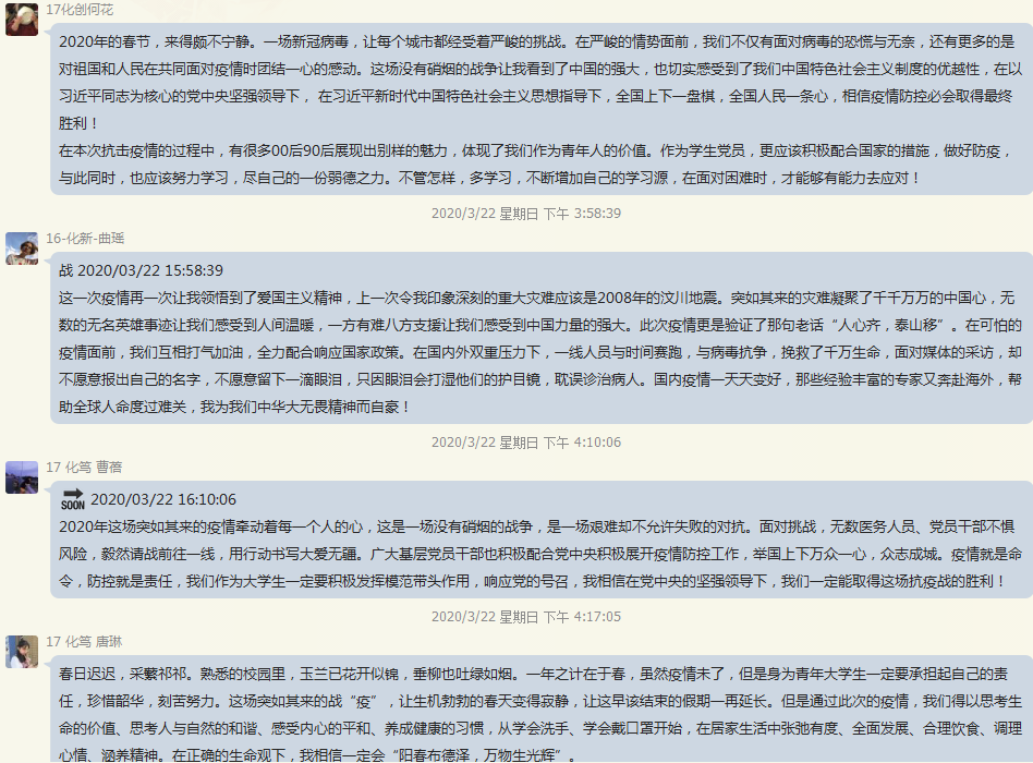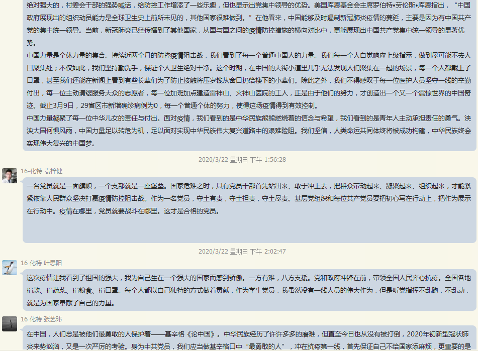 3月15日,习近平总书记给北京大学支援湖北医疗队全体“90后”党员回信,对新时代的中国青年深情点赞,同时提出殷切期望。党支部积极号召全体党员结合疫情期间,自己积极参与抗疫、克服困难、刻苦学习、增强本领的经历,分享自己的感悟。