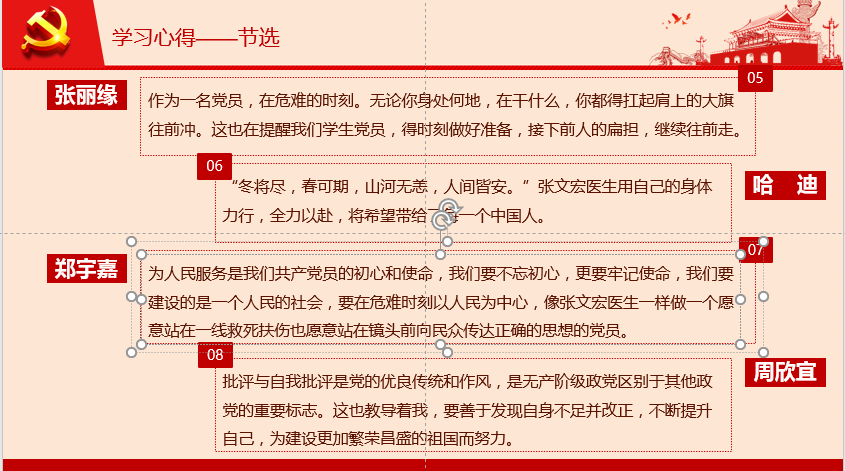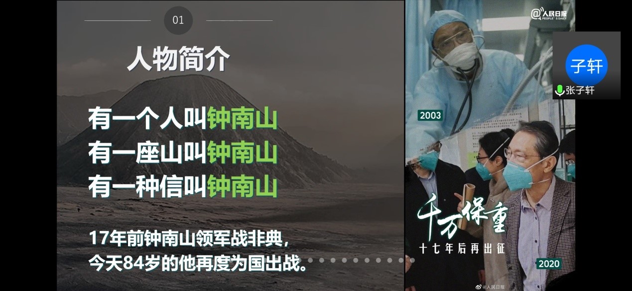 会上,各小组为我们讲述了为国出征的钟南山院士、心怀天下的李兰娟院士、疫情的第一批“吹哨人”李文亮医生、渐冻症患者张定宇院长、“硬核医生”张文宏、援鄂护士张静静的感人故事,分享了他们的学习心得。通过他们的汇报,让我们感受到了在抗击疫情过程中展现的中国精神和中国力量。