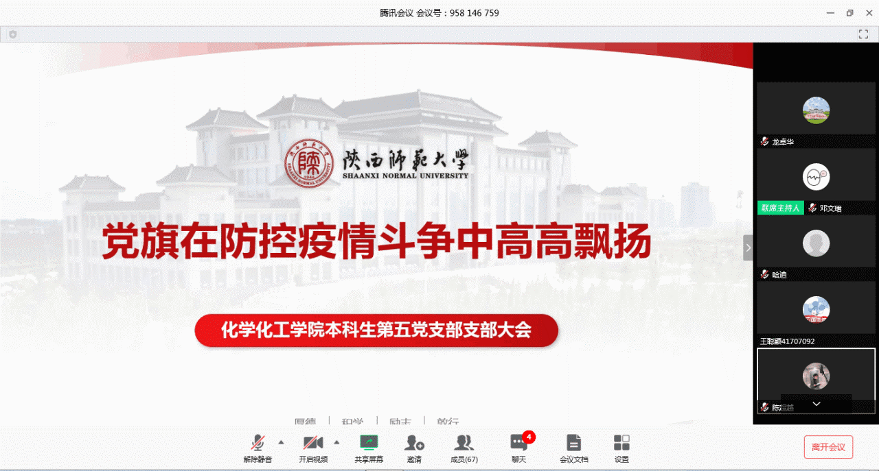 面对突如其来的新冠肺炎疫情,全国人民展开了一场轰轰烈烈的疫情防控阻击战。奋战在抗击疫情一线的广大党员干部,始终根据党中央的统一部署,在不同的岗位上为抗击疫情发光发热,贡献着自己的力量。为了向抗击疫情的党员模范学习,号召青年党员以抗疫党员模范为榜样,把爱国情、强国志、报国行自觉融入到学习生活中去,化学化工学院本科生第五党支部于4月12日晚上7点通过腾讯会议平台召开以 “党旗在防控疫情斗争中高高飘扬”为主题的线上学习会议。本次会议由支部书记翁思洁主持,支部组织委员龙卓华、支部宣传委员邓文珺以及支部全体党员参加会议。