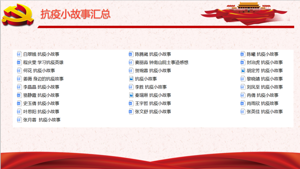 第二部分,党支部依托腾讯会议平台,号召支部党员对身边发生的抗疫小故事进行分享。李汶颖同志分享了家人作为湖南本地第一批抗疫护士,奋战一线的英勇事迹;刘国强同志分享了假期期间,学校为保障师生安全,积极做好防控工作的事迹;魏济明同志分享了2020届毕业生谭秋慧为基层防疫助力,主动前往社区服务站成为志愿者的事迹。会议之后,一部分同志将自己身边的战“疫”故事和感想制作成文档进行了分享。