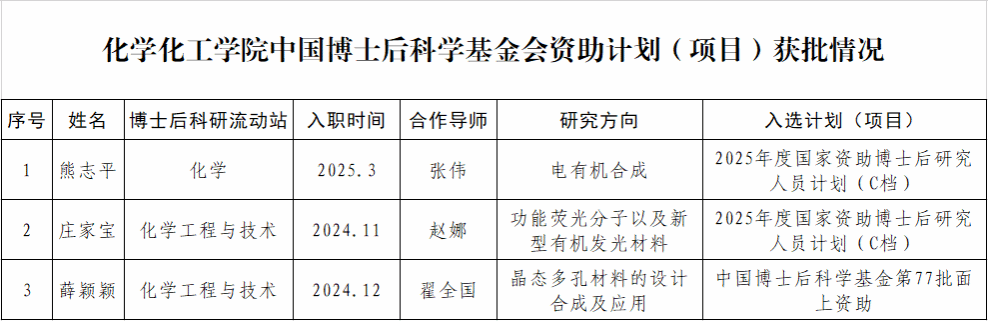 近日,全国博士后管委会办公室、中国博士后科学基金公布多个资助计划(项目)评选结果,我院化学博士后科研流动站熊志平博士后、化学工程与技术博士后科研流动站庄家宝博士后获批2025年度国家资助博士后研究人员计划(C档),我院化学工程与技术博士后科研流动站薛颖颖博士后获批中国博士后科学基金第77批面上资助项目。