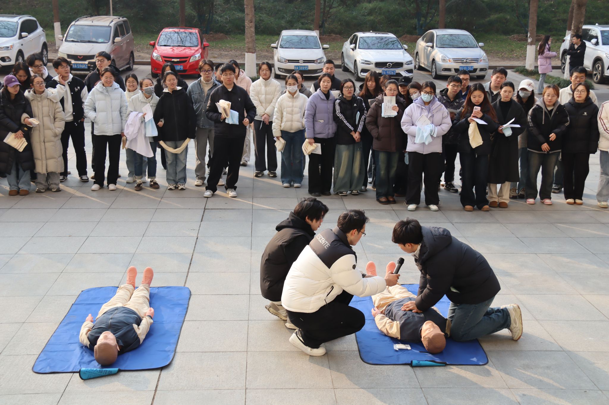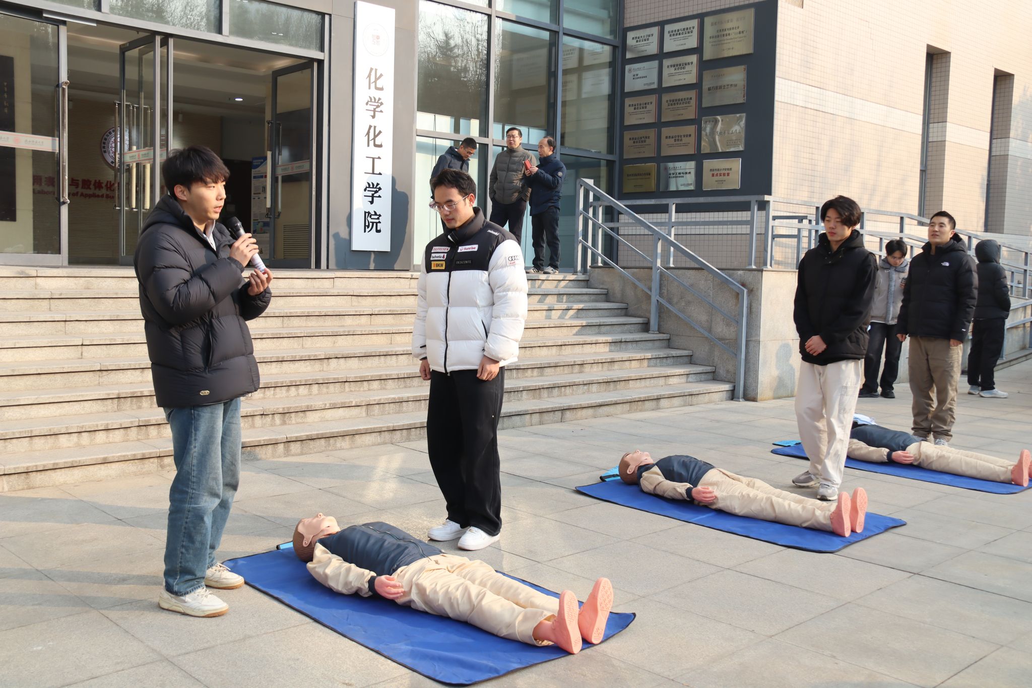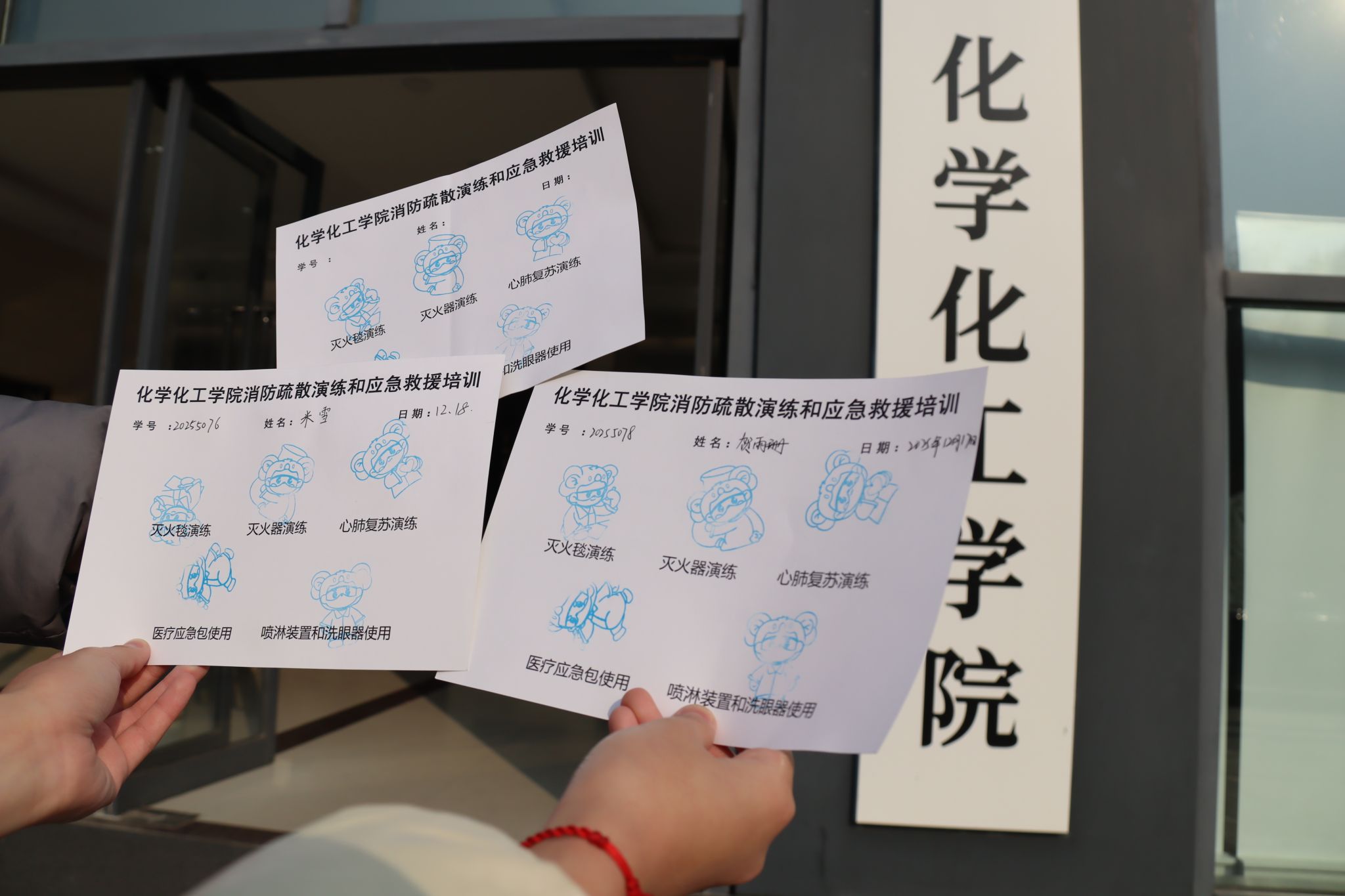第二阶段专项应急救助培训面向全院研究生及教职工分组开展,涵盖三大板块内容:一是灭火项目培训,包括灭火毯、灭火器实操演练;二是医学紧急救助培训,涵盖心肺复苏和医疗应急包使用;三是喷淋装置和洗眼器使用培训。培训中,校医院外科大夫李米红针对实验与火灾场景中的常见外伤,详细讲解了关键急救步骤,并现场演示了医疗应急包内物品的规范使用方法;体育学院研究生王一凡按照 “判断患者反应、纠正患者体位、判断脉搏、胸外按压、开放气道、人工呼吸”6 个步骤,现场示范心肺复苏关键急救技术;实验中心相关老师详细演示灭火器、灭火毯等消防器材使用方法及注意事项;各楼层负责老师全程指导监督喷淋和洗眼器装置使用,确保参训人员逐一完成理论学习与实践操作。为提升培训互动性与参与度,本次培训创新采用 “化学化工学院消防疏散演练和应急救援培训卡” 集章打卡模式,参与者每完成一项培训内容,工作人员即在卡片对应位置加盖学院 IP 形象 “化小星” 专属印章,有效激发了学生参与热情。