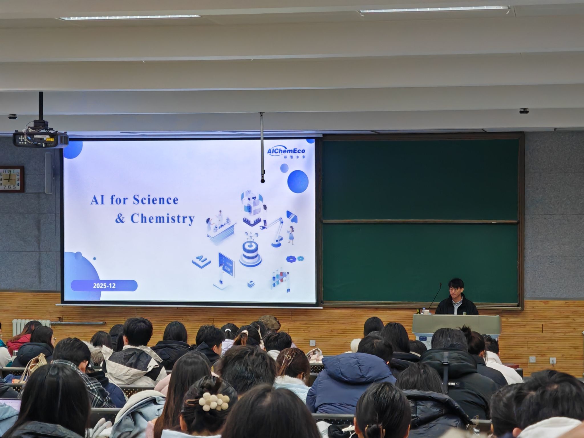 12月28日,我院“AI+化学”前沿交叉课程正式开课。课程首讲特邀广州国家实验室助理研究员张崇焕博士主讲,内容涵盖AI for Science & Chemistry、化学数据与数据库、特征工程与描述符、数据可视化、正向预测和逆合成分析等六大模块,系统展示了人工智能技术发展以及如何深度赋能现代化学研究。本次课程采用“线下主场+线上开放”的教学形式,线下面向我院一年级280余名博士和硕士研究生开设,线上同步面向全体师生开放。本课程是提升全体师生AI素养的重要途径,是我院推动人工智能赋能人才培养创新,构建系统化的AI+化学交叉培养体系的举措之一。