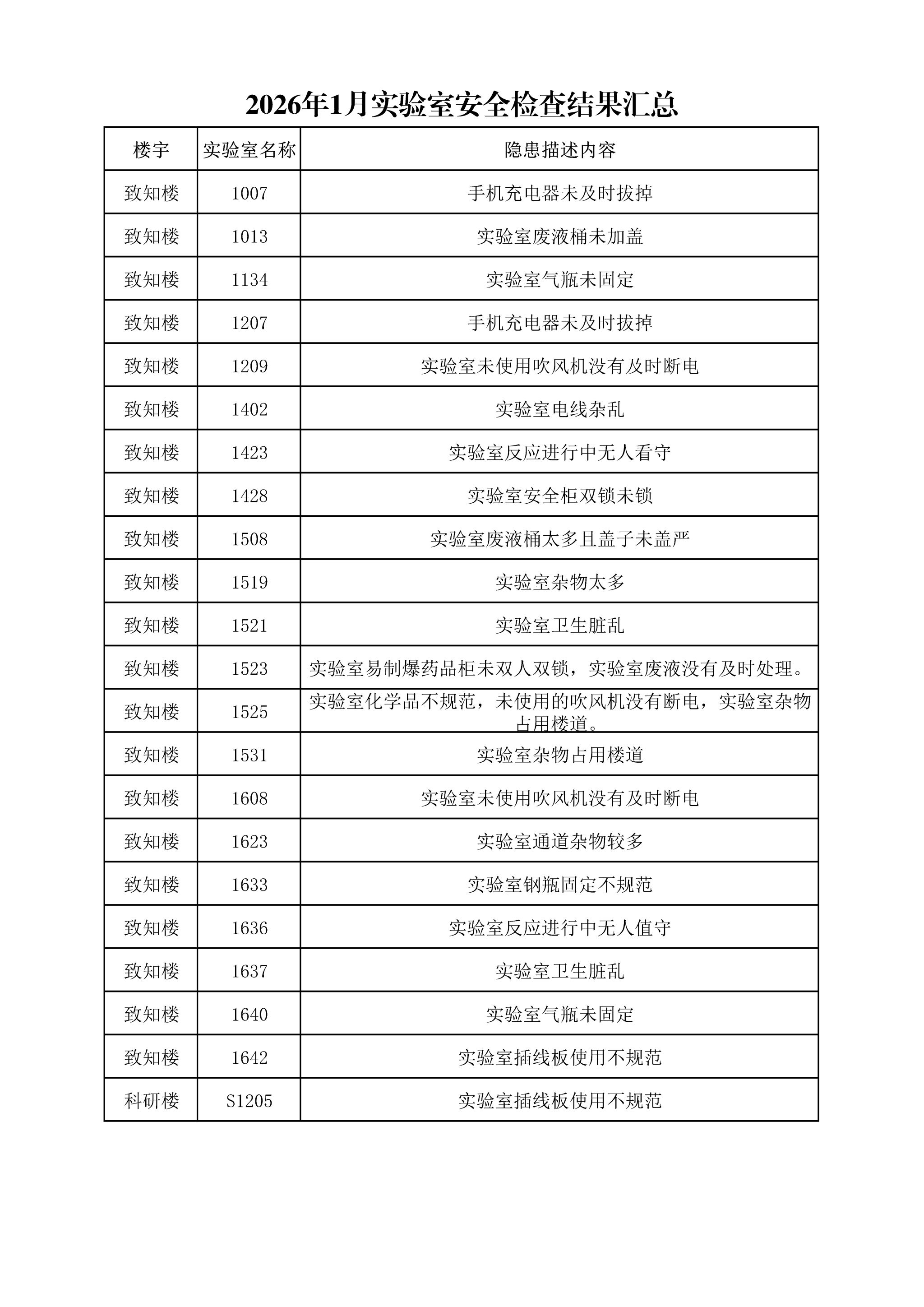 经检查,大部分实验室安全情况合格,但仍存在以下安全隐患:1、部分实验室用电不规范,手机、吹风机等不及时断电;2、实验室反应进行无人值守;3、实验室卫生条件不合格、废液不及时清理等。现将具体检查情况通报如下,请相关实验室严格按照安全规范及时整改,保障实验室的安全运行。