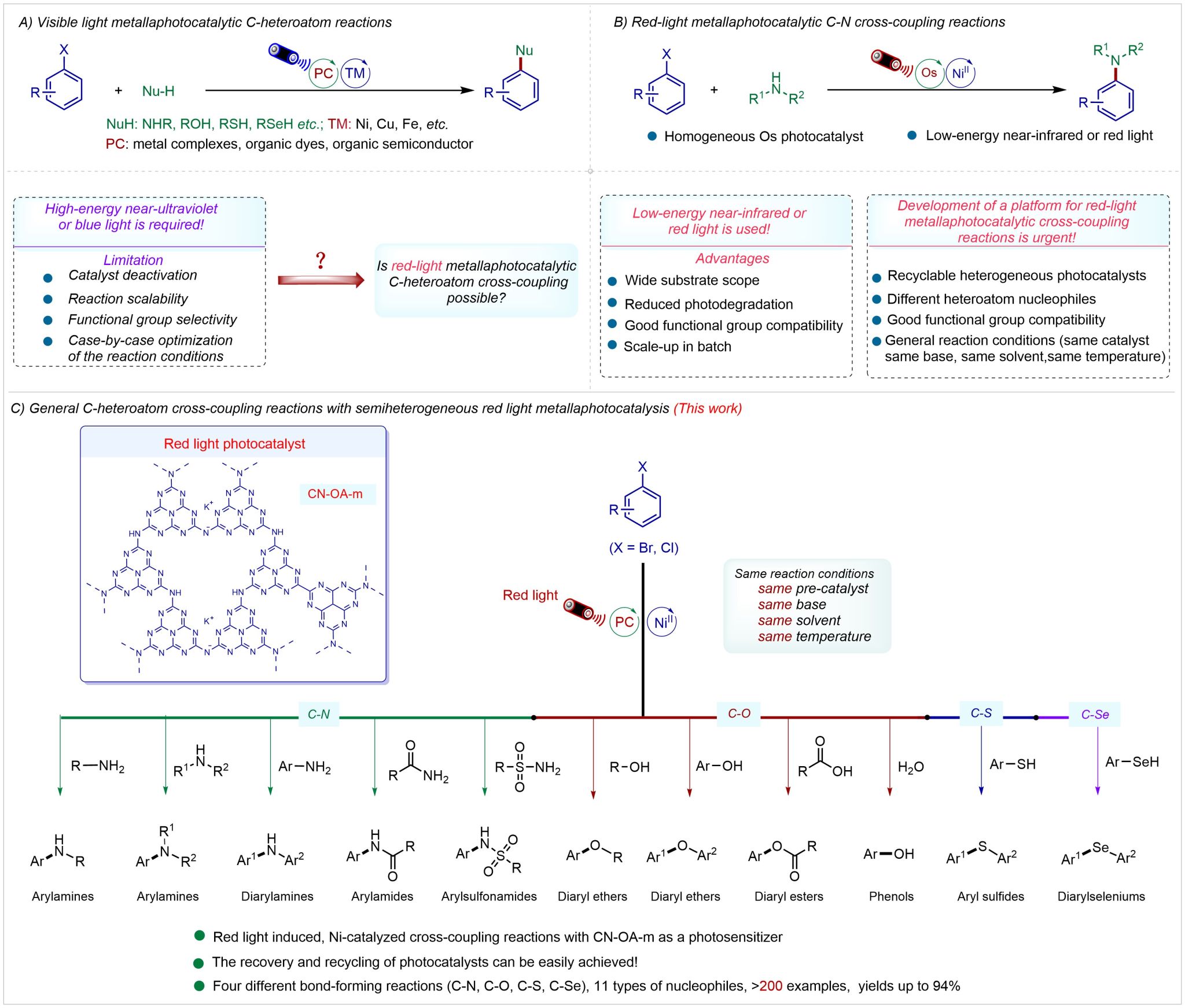 过渡金属催化的交叉偶联反应是精细化学合成中的重要工具,其中,芳基C(sp2)–(杂)原子偶联反应是探索最多的有机转化反应之一,已成为药物合成领域最常用的偶联反应之一。然而,在很大程度上这些方法仍然取决于各种配体、预催化剂和逐一优化反应条件以达到优异的收率。将过渡金属催化剂与已建立的光催化剂(如金属配合物、有机染料和有机半导体)相结合,成为克服上述许多挑战的一种有价值的方法。然而,迄今为止报道的光催化反应都需要蓝光或高能近紫外光,这导致可扩展性、化学选择性和催化剂失活,同时可见光的低穿透性限制了其工业应用的放大过程。红光或近红外在太阳光中十分丰富,且在各种不同的反应介质中具有较高的穿透性,可以作为有机反应的理想替代光源。然而,由于近红外光的低能量,其发展仍然具有很大的限制。因此,寻找吸收近红外光并参与光反应过程的光催化剂是主要挑战之一。