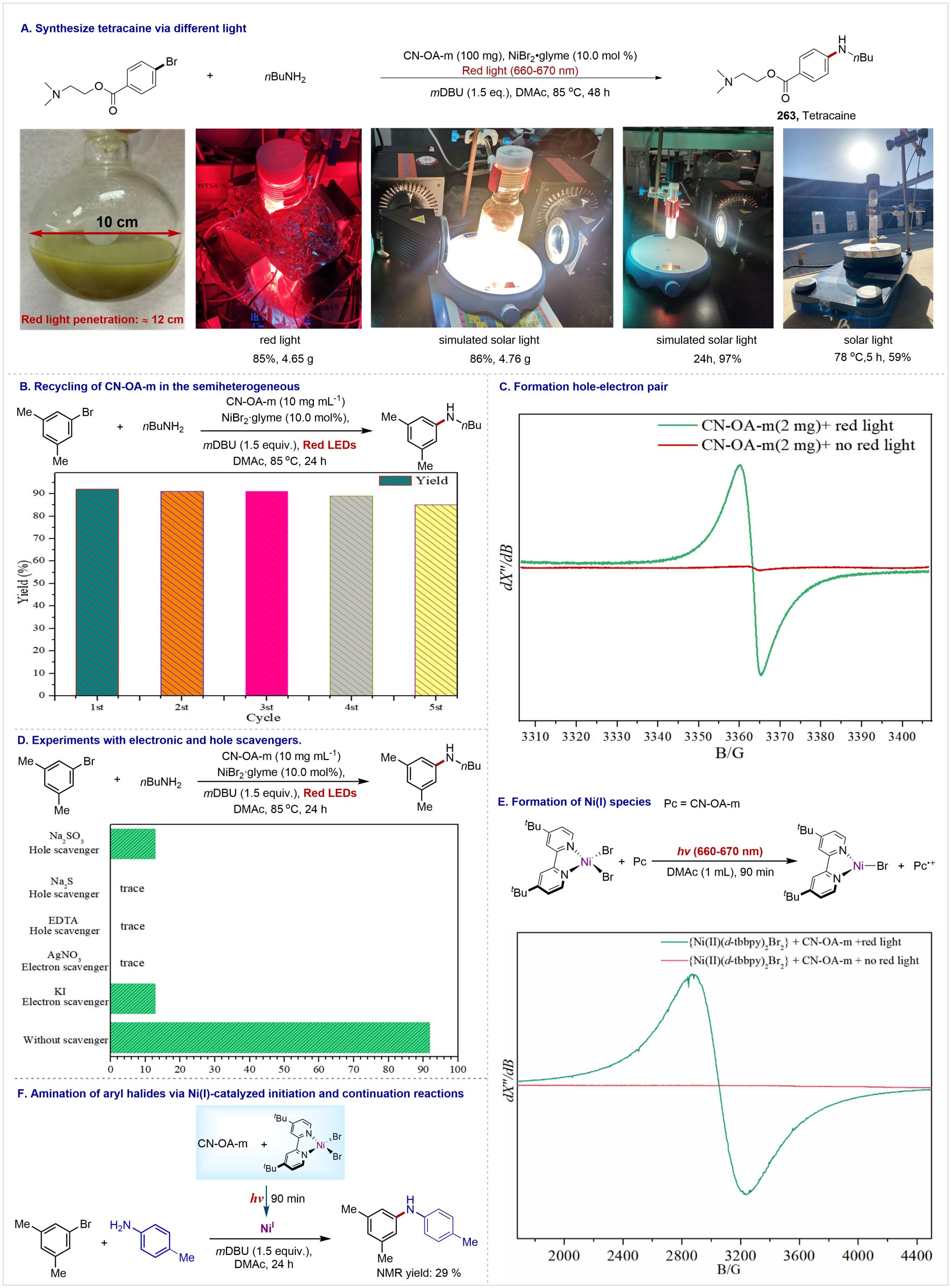 (A) 在不同光源下合成四卡因的反应,包括红光、模拟太阳光和太阳光;(B) CN-OA-m在半均相催化中的回收利用,经过五次循环后,产率仅有轻微下降;(C) 通过电子顺磁共振(EPR)光谱检测到氮空位(g值为2.003),表明红光照射产生了电子;(D) 展示了加入电子或空穴猝灭剂后,红光促进的反应进展显著减缓,证实了光生电荷在光催化偶联反应中的重要作用;(E) 通过EPR光谱检测到Ni(I)物种;(F) 在红光照射下,通过Ni(I)物种催化启动并持续进行的芳基卤化物胺化反应。