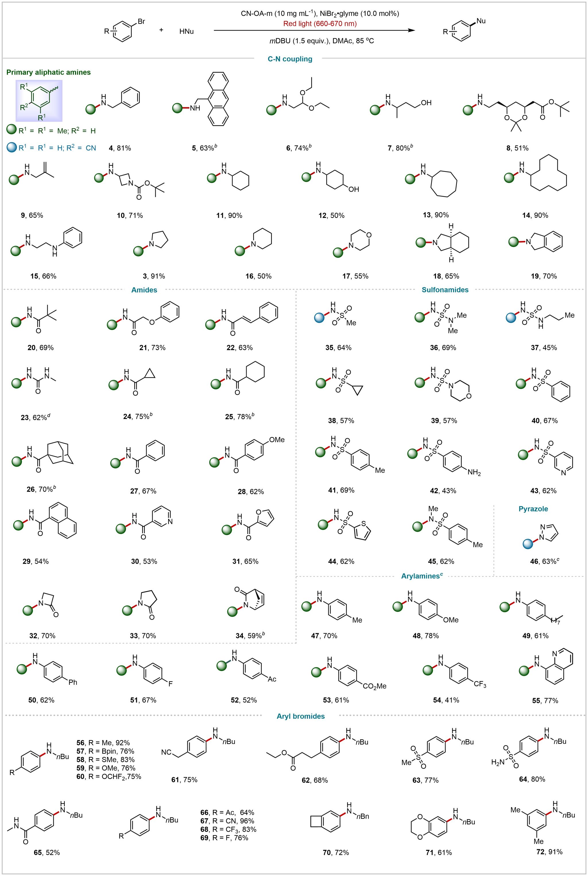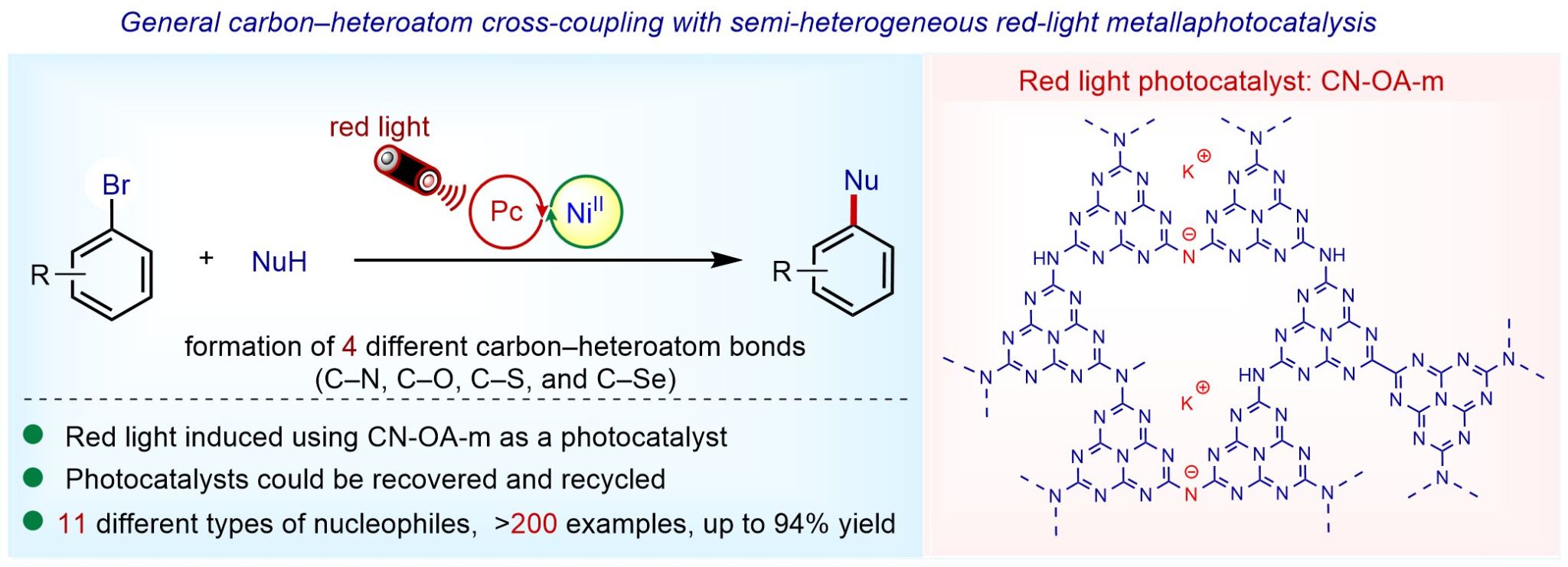 氮化碳由于其热稳定性和化学稳定性、易于制造并可以通过过滤或离心回收,是一种廉价、环境友好且很有前景的光催化剂的替代品,但它们在红光催化交叉偶联反应中的应用目前很少。针对这一问题,绿色催化与合成团队薛东课题组基于前期的研究基础 (Angew. Chem. Int. Ed. 2021, 60, 5230; Angew. Chem. Int. Ed. 2021, 60, 21536; ACS Catal. 2022, 12, 15590; ACS Catal. 2024, 14, 4968; Angew. Chem. Int. Ed. 2024, 63, e202314355; J. Am. Chem. Soc. 2024, 146, 39, 26936; J. Am. Chem. Soc. 2025, 147, 5851),与顾泉教授合作发现一种非均相碳化氮(CN-OA-m)可以作为红光催化剂 (图2, 3),与丰产金属镍催化结合实现高效的C-杂原子偶联反应新体系。这一新体系能够实现C−N、C−O、C−S、C−Se等与11种不同亲核试剂(脂肪胺、芳胺、酰胺、磺酰胺、醇、酚、羧酸、硫酚,硒)的C(sp2)-杂原子的交叉偶联。