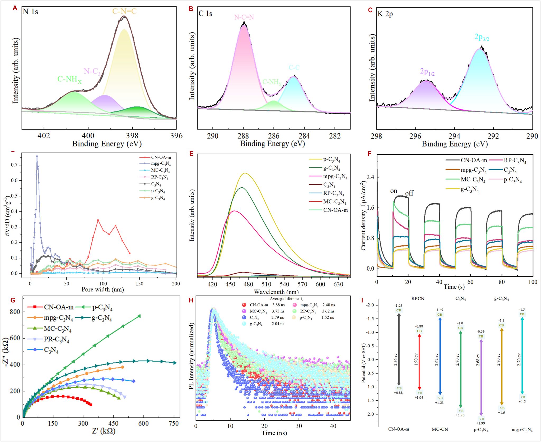 (A-C) CN-OA-m的XPS光谱,分别展示了C 1s、N 1s和K 2p的谱图,确认了C、N和K元素的存在;(D) 孔径分布图,显示CN-OA-m具有高度发达的多孔网络;(E) PL光谱,显示CN-OA-m具有最弱的PL强度,表明光生载流子复合受到抑制;(F) 光电流响应图,显示CN-OA-m具有最高的光电流,表明其优异的电子-空穴分离和传输能力;(G) EIS谱图,显示CN-OA-m具有最小的半圆半径,表明其较低的界面电荷转移阻抗和更快的电子迁移率;(H) TRPL光谱,显示CN-OA-m具有最长的荧光寿命,表明光生电子-空穴对的复合速率降低;图(I) 为电化学势能图,显示CN-OA-m具有最高的还原电位,表明其可能参与光氧化还原反应;这些表征结果表明,CN-OA-m作为光催化剂在反应中具有优异的性能。
