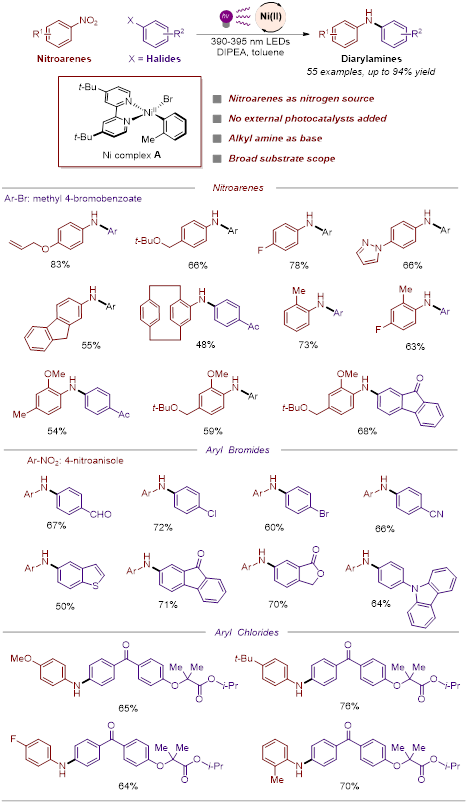 在前期研究的基础上,陕西师范大学绿色催化与合成团队实现了光促进镍催化硝基芳烃与芳基卤化物的直接C-N偶联反应。该催化体系使用对空气稳定的Ni(II)-芳基络合物为催化剂,温和的三级胺DIPEA为碱,不需要外加光敏剂。该反应底物适用范围广泛,官能团耐受性好,对于邻位有空间位阻的硝基芳烃和卤代芳烃都表现出高的活性。