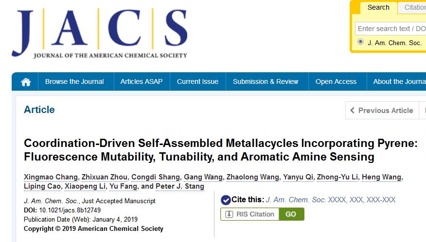 全文详见:Xingmao Chang, Zhixuan Zhou, Congdi Shang, Gang Wang, Zhaolong Wang, Yanyu Qi, Zhong-Yu Li, Heng Wang, Liping Cao, Xiaopeng Li, Yu Fang*, and Peter J. Stang*, Coordination-Driven Self-Assembled Metallacycles Incorporating Pyrene: Fluorescence Mutability, Tunability, and Aromatic Amine Sensing. J. Am. Chem. Soc., 2019, DOI: 10.1021/jacs.8b12749.