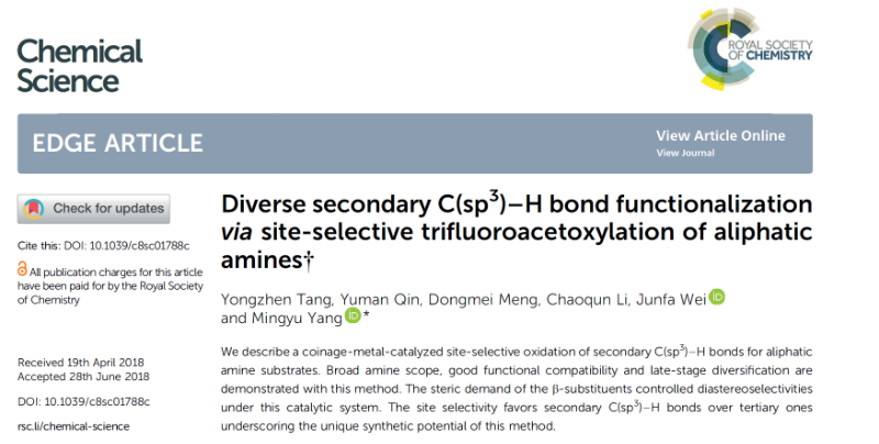 全文详见:Yongzhen Tang, Yuman Qin, Dongmei Meng, Chaoqun Li, Junfa Wei, Mingyu Yang *; Diverse secondary C(sp3)–H bond functionalization via site-selective trifluoroacetoxylation of aliphatic amines; Chem. Sci. 2018, asap. DOI: 10.1039/c8sc01788c(http://pubs.rsc.org/en/content/articlepdf/2018/sc/c8sc01788c?page=search)