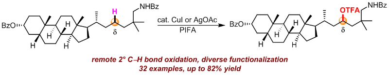 近日,我院“功能有机分子合成化学研究团队”杨明瑜副教授课题组以苯甲酰基保护的脂肪族胺类化合物为研究对象,基于分子内1,5-氢迁移的策略,以钱币金属铜和银为催化剂,实现了脂肪族胺类化合物中二级碳氢键的选择性三氟乙酰氧基化及后期连续的官能团转化。该方法具有底物普适性广、官能团兼容性好等优点。这一研究成果在国际学术期刊《Chemical Science》上在线全文发表,硕士研究生唐永珍为该论文第一作者,杨明瑜副教授为论文通讯作者,陕西师范大学为唯一署名单位。