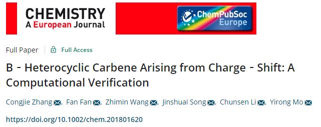 该研究工作“B-Heterocyclic Carbene Arising from Charge-Shift: A Computational Verification”首次将前期所研究分子命名为“硼杂环卡宾”,而且发表在国际学术期刊《欧洲化学》上(全文见: http://dx.doi.org/10.1002/chem.201801620)。