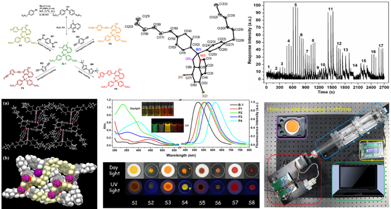 基于嗅觉的荧光探测必须建立在高性能敏感薄膜材料之上。在过去的二十年里,我院房喻教授研究组一直致力于荧光敏感薄膜材料的创新制备、薄膜器件化、器件阵列构建研究,培养了包括1名全国百篇优博论文获得者、1名国家博新计划入选者,以及4名陕西省优博论文获得者在内的优秀人才,发展了一系列荧光敏感薄膜材料,研制了爆炸物、毒品等有害物质高性能传感器和探测仪器,实现了技术转移。产品在G20峰会、博鳌论坛、外国元首接待,以及中央军委、乌干达总统府、深圳地铁等重大活动或重要场所安全保卫中发挥了重要作用。