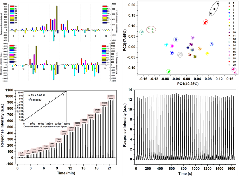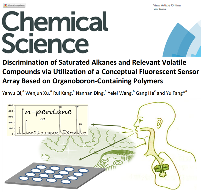 饱和烷烃是一类重要的信号物质,在消化系统、呼气系统某些疾病,特别是肺癌的早期诊断,油气资源的普查勘探中具有重要的意义。然而,饱和烷烃化学性质稳定,也缺乏光电活性,这就使得其原位在线高灵敏探测变得十分困难。针对这一挑战,房喻教授小组创造性将非平面荧光单元引入薄膜结构,制备了富含“分子通道”的荧光薄膜阵列,利用内聚能差异,薄膜通道的体积选择、极性选择,以及传感单元荧光量子产率的溶剂依赖性等,在自行搭建的系统上实现了对饱和烷烃的气相高灵敏选择性快速识别和检测。对肺癌标示物正戊烷的检测灵敏度可达3.7 ppm以下,系统响应速度小于1 s,且可实现稳定重复使用,有望在肺癌早期诊断中获得应用。该工作近期在化学领域顶级期刊《Chemical Science》上在线全文发表。论文第一作者为我院2016级博士研究生祁彦宇同学,合作者包括硕士研究生徐文君、康蕊,本科生丁南南,物理学与信息技术学院硕士研究生王烨蕾,以及西安交通大学的何刚教授等,通讯作者为房喻教授。