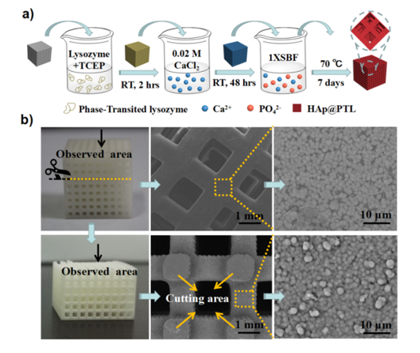 图2. HAp@PTL材料在3D复杂结构内外表面的矿化(a) 制备示意图; (b) 3D复杂结构内外表面的HAp涂层制备