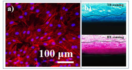 图4. HAp@PTL材料的细胞形态(a)及动物组织切片染色(b, c)(8周体内培养后)。