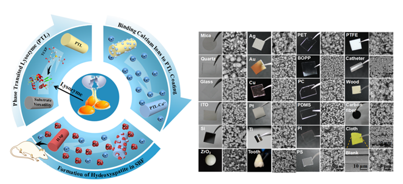 图1. 基于类淀粉样溶菌酶组装薄膜 (PTL nanofilm) 的HAp涂层制备示意图(左)及其在各类材料表界面的形成与黏附。