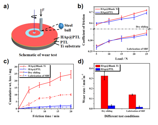 图3. HAp@PTL材料的机械性能 (a) 摩擦实验示意图; (b-d) HAp@PTL涂层材料对比于空白对照组的磨损率和磨损量对比。