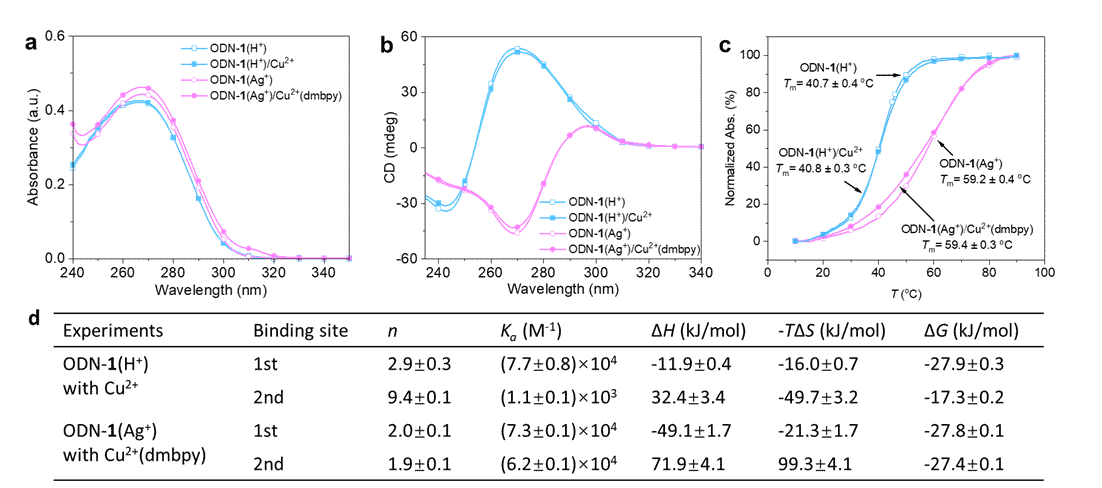 为揭示ODN-1(Ag+)的配位结构,进行了质谱(MS)和等温滴定量热(ITC)(图3a-b)。鉴于ODN-1序列包含8个胞嘧啶和4个鸟嘌呤,提出了6个Ag+离子在ODN-1(Ag+)内形成了4个C−Ag+−C和2个G−Ag+−G碱基对。为探究ODN-1的折叠拓扑结构,采用了聚丙烯酰胺凝胶电泳(PAGE)技术(图3c),说明ODN-1(H+)和ODN-1(Ag+)均是分子内折叠的拓扑结构。为探究DNA的构象变化,进行了荧光共振能量转移(FRET)检测(图3d),实验结果表明Ag+加入造成ODN-1(H+)的5’端和3’端靠近。最后,基于全面的表征数据推测ODN-1(Ag+)的结构最可能为模型V(图3e)。
